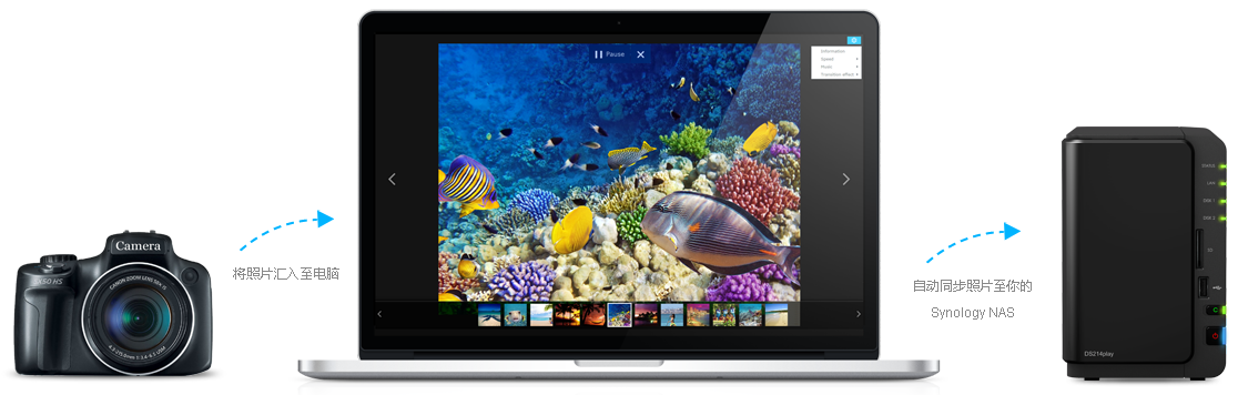 對于專業(yè)攝影師而言,一個容易上手的備份方案至關(guān)重要。有了 Cloud Station,將照片同步到 Synology NAS 變得十分簡單。在匯入相機(jī)的照片后,你只需將文件丟進(jìn)電腦里指定的文件夾,它們就會自動上傳到 Synology NAS。