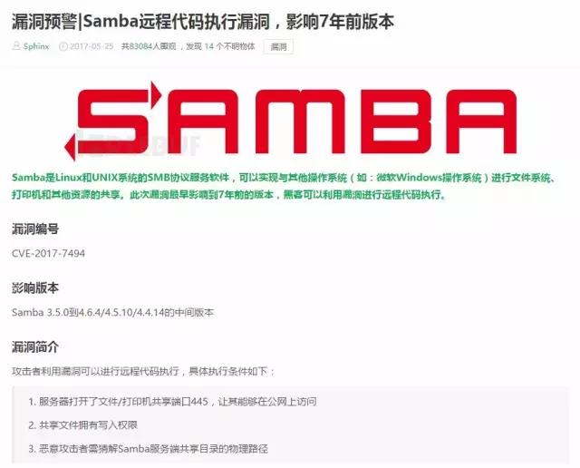 【群暉快報】2017年5月24日Samba發布了4.6.4版本,修復了一個嚴重的遠程代碼執行漏洞,漏洞編號CVE-2017-7494。該安全漏洞可以讓一個有權限的用戶提權至Samba所在服務器的root權限,進而執行惡意程序,向該服務器發動攻擊。